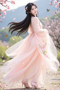 An ancient fairy with flowing black hair like a waterfall, adorned with a cherry blossom hairpin, with pink butterflies fluttering in her hair, adding softness and liveliness. She wears a pink gauze dress embroidered with blooming cherry blossoms and tender green willow leaves, paired with exquisite pink high heels, showcasing the romance and elegance of spring. Standing in a cherry blossom forest, with petals falling like rain, butterflies fluttering among the petals, as if sharing the beauty and dreaminess of spring. Her expression is gentle and serene, her eyes filled with a faint smile, as if savoring the poetic moments of spring.
