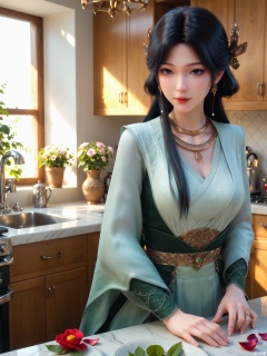 score_9,score_8_up,score_7_up,1girl,looking_at_viewer,realistic,1girl,Vivid Colors,bright environment,sunshine,god light,delicate water,hair_ornament,shiny skin,shiny hair,reflection,(wariza:1.2),dress,jewelry,flower sea,falling petals,extreme detail description,bright sunlight,frontal lighting,(upper body:1),put one hand on your side,kitchen,kitchen,long_hair,(skindentation:1.3),Fishnet stockings,black hair,bright