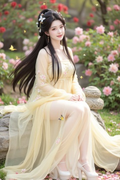 Amidst a blooming flower garden, an ancient fairy sits gracefully in a side-sitting pose at the center of the scene. Her black hair gently cascades, adorned with a few dancing butterflies, as if dancing with the summer breeze. She wears a pale golden gauze dress, embroidered with delicate summer flower patterns, the light fabric flowing with the wind, resembling a fairy in the summer flower sea. At her feet, a carpet of colorful petals scatters, complementing the flower patterns on her skirt.