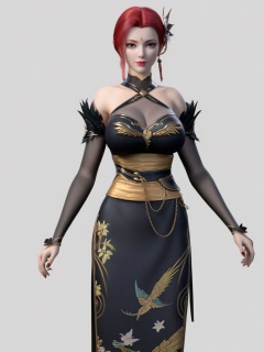 score_9,(perfect_anatomy:1.1)1girl,looking at viewer,breasts,large breasts,solo,standing,hair ornament,black dress,eyeshadow,red hair,detached sleeves,looking at viewer,white background,simple background,<lora:SF_YaFei_NianFanFace_Pony_Realism2.3-000004:0.7>,cowboy_shot,