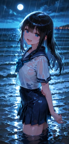 black hair, long hair, sailor collar, school uniform, serafuku, shirt, skirt, blue sailor collar, blue skirt, white shirt, 1girl, open mouth, moon, night, ocean, partially submerged, rain, smile, solo, depth of field, deep shadows, backlighting, perspective, masterpiece, best quality, amazing quality, very awa, absurdres,