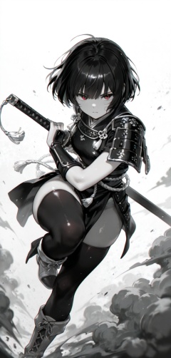 short hair, battoujutsu stance, fighting stance, katana, boots, thighhighs, bracer, 1girl, white background, dust cloud, holding, holding sheath, holding sword, holding weapon, iaidou, ready to draw, sheath, sheathed, solo, spot color, sword, weapon, motion blur, portrait, perspective, vignetting, masterpiece, best quality, amazing quality, very awa, absurdres,