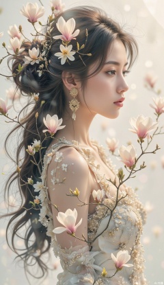 A sensual beauty, a calligrapher of elegance, wields her delicate brush with precision and finesse.she brings to life the night's secret blooms on a soft, chiffon canvas. magnolia petals unfurl like tender kisses, as the strokes of her brush dance across the fabric, weaving a tapestry of serenity and beauty.,marrta,double-exposure,