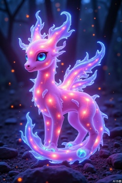 Translucent pink and purple flames form a light body, with star-like light spots flashing at the tips of the ears and tails. The tails of seven flames are intertwined like flowing aurora, and the eyes are filled with mysterious blue light. Ice blue flames spread out from the light touch of the claws. They are in the fluorescent forest at night, watercolor smudge style, soft light and shadow effects