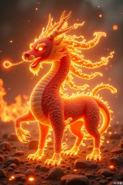 The whole body is covered with red and golden flame scales, and the mane dances like burning flames. The four hooves step out of the golden fire lotus, the horns of the head are wrapped around red light, and the rolling fireballs are sucked in the mouth. Nine long flames are dragged behind them. Each tail tip is filled with flames of different colors. The background is a burning sea of clouds, an ancient style mythological scene, 8K ultra-high definition, delicate flame dynamic rendering