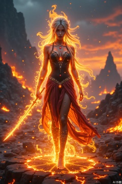 The picture is an ancient style fantasy style with gorgeous colors and fantasy sense. A graceful ancient beauty, her body is surrounded by colorful flames, and the flames are like flowing liquid, constantly changing shapes. Her hair was silver, and the ends were burning with white flames, like a meteor passing through the night sky. She was wearing a black tights with red gems inlaid with flames that shone with light. She held a sword burning with colorful flames. The sword body was as transparent as crystal, and the energy of flames flowed inside. She stood on a suspended flame platform surrounded by swirling flame vortexes, and in the distance were burning mountains and erupting volcanoes. In terms of composition, the beauty is located at the upper center of the picture, with the flame platform and the distant scenery as the background.