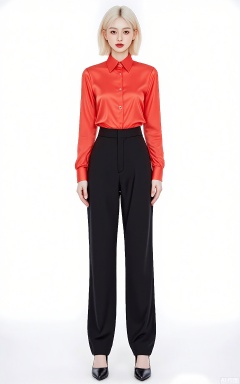 SDMT, Full-body shot of a woman with platinum-blonde hair in a bob, wearing a scarlet-red satin blouse tucked into high-waisted black tailored pants, paired with pointed-toe pumps. She stands confidently against a white background, with sharp studio lighting.