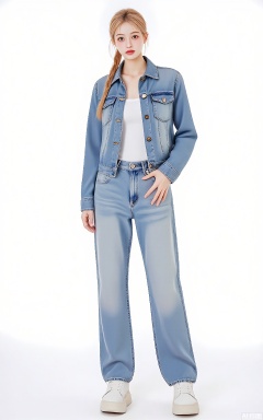 SDMT, Full-length image of a woman with honey-blonde hair in a side braid, wearing a cobalt-blue denim jacket over a white tee and light-wash jeans, paired with white sneakers. She stands with hands in pockets on a white backdrop, with casual studio lighting.