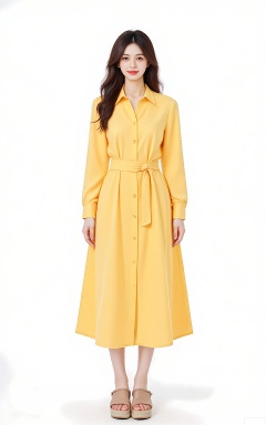 SDMT, Full-length image of a woman with caramel-highlighted waves, wearing a sunflower-yellow linen midi dress with a belted waist and espadrille wedges. She stands smiling on a white seamless, with golden-hour-inspired diffused lighting.