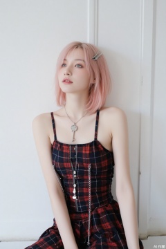 bright analog film style,F1CNYeeMM,sheyin,girl,bright analog film style,In a bright analog film style,The image displays a young woman with a striking appearance,captured in a vertical format. Her hair is a soft pink tone with a messy,wavy bob style that frames her face,accentuated with a couple of silver barrettes. She wears an eye-catching ensemble featuring a tartan corset top paired with a matching low-rise skirt accessorized with chains and pendants,including a key and other varied charms. Her expression is contemplative and somewhat introspective,with large,clear eyes and light makeup that emphasizes her natural features. The background is minimalist,a subdued white with faint vertical stripes,which ensures that the focus remains firmly on her. Her pose is casual yet composed,with one hand lightly touching her waist,enhancing the relaxed yet styled theme of the photograph.,