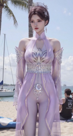 SFW,(masterpiece:1.2),best quality,absurdres,masterpiece,original,extremely detailed wallpaper,perfect lighting,1girl,solo,looking at viewer,(cowboy_shot:1.3),long hair,high heels,blurry background,depth of field,motion blur,(long dress:1.23),crystal_earrings,headpiece,hair_tie,chest_jewel,gem,necklace,jewelry,in summer,day,outdoors,nature,(standing,Seaside, beach, sailboat, coconut trees:1.59),(huge breasts:2.99),(full breasts:2.99),,large natural breast,soft breasts,,XyunyunXY,Xmeining,Xjiangziyue,Xweinina,Xyunxiao
