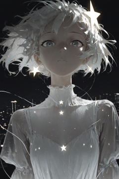 masterpiece,best quality,amazing quality,very aesthetic,absurdres,newest,highres,dino_(dinoartforame),1girl,close-up,looking_at_viewer,neon,loose_sleeves,glitch_art,glitch_effect,black_background,scanlines,monochrome,power_lines,wide_shot,reddish_sky,grassy_hill,neutral_expression,star_hair_accessory,city_lights,simple_background,skyline_view,stylish,dark_theme,flowing_white_dress_with_translucent_layers,soft_glow,ethereal_aura,aesthetic_pixelation,foliage_in_background,misty_vibes,