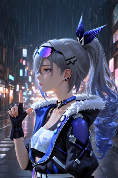 masterpiece,best quality,amazing quality,very aesthetic,absurdres,newest,highres,nixeu:0.5,yoneyama mai:0.5,1girl,solo,silver wolf \(honkai: star rail\),honkai \(series\),cyberpunk,street,night,darkness,metallic texture,from side,ray tracing,pointing to you,rain drops on the girl,strong color performance,oil painting style,