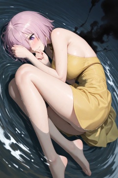 masterpiece,best quality,amazing quality,very aesthetic,absurdres,newest,highres,mash kyrielight,fate \(series\),1girl,full_body,curled up,lying in the water,with black smoke,looking,tears,yellow_dress,