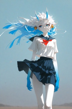 masterpiece,best quality,amazing quality,very aesthetic,absurdres,newest,highres,highres,absurdres,(artist:saya \(saya no uta\):0.3),dino_(dinoartforame),(artist:quasarcake:0.4),absurdres,highres,newest,flat colors,spot colors,( background:1),wind,flowing hair,messy hair,monster girl,oni girl,gradient skin,pale skin,blue eyes,white skin,oni horns,blunt ends,blue eyes,eyeshadow,hair bell,two-tone hair,white hair,blue_hair_ends,small breasts,school uniform,