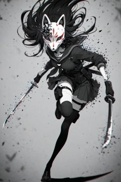 1girl,action pose,fox_mask,fox fire,mechanical eye,holding sword,school uniform,harness,thigh pouch,silhouette art,glitch art,virtual,colored shadow,geometry,monochrome,local color adaptation,hdr,(disintegration effect:1.4),(chromatic aberration, polarized:1.2),(blurry:1.4),masterpiece,best quality,amazing quality,very aesthetic,absurdres,newest,