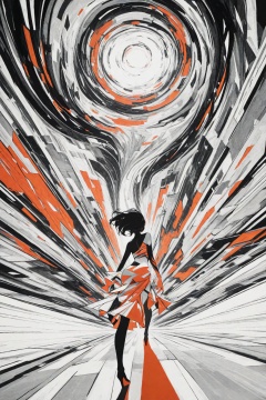 1girl,from behind,asymmetrical clothes,cubism,monochrome,spot color,fluorescence,local color adaptation,(foreshortening:1.2),painterly,silhouette art,masterpiece,best quality,amazing quality,very aesthetic,absurdres,newest,