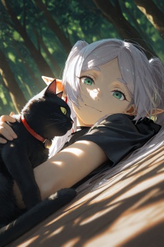 masterpiece,best quality,amazing quality,very aesthetic,absurdres,newest,extreme aesthetic,in the style of fashion photography,light particles,cinematic lighting,Visual impact,sharp focus,Emotionalization,depth of field,dutch angle,scenery,(dino_(dinoartforame):0.5),(yoneyama mai:0.5),(Yomu:0.3),(quasarcake:0.4),(wlop:0.3),painting \(medium\),(flat color),Frieren,smiling,holding black cat,enchanted forest,no hand in frame,masterpiece,best quality,good quality,very aesthetic,absurdres,newest,8K,depth of field,focused subject,close up,stylized,wabi sabi,1girl,looking at viewer,dynamic angle,from below,from side,relaxing,
