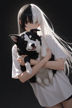 masterpiece,best quality,amazing quality,very aesthetic,absurdres,newest,extreme aesthetic,in the style of fashion photography,light particles,cinematic lighting,Visual impact,sharp focus,Emotionalization,depth of field,dutch angle,scenery,1girl, solo, symmetry, symmetrical composition, hair over eyes, long hair,split-color hair, white hair, black hair, split-color clothes, white t-shirt, black t-shirt, split-color dog, black fur, white fur, holding dog, brown eyes, black background, gradient background
