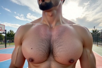 close up of well-developed pectorals. chest hair around the prominent nipples. Their is a hint of black shaved stubble on the chin, indicating the male gender.