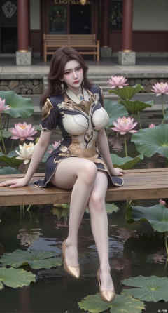 SFW,(masterpiece:1.2),best quality,The image is a digital illustration of a young woman sitting on a wooden bench in a pond with lily pads. She is wearing a long dress with design on the chest and sleeves. The dress has a high neckline and short sleeves,Holding a lotus in hand. She has long dark hair styled in loose waves and is wearing gold high heels. The woman is posing with one hand on her hip and the other resting on the edge of the bench. The background is filled with pink and white lotus flowers and green leaves. The overall mood of the image is peaceful and serene,(huge breasts:2.99),(full breasts:2.99),(Background with traditional Chinese architecture, lotus pond and pink lotus flowers:1.39),,Xanmiaoyi,Xyunwangshu,XlishaoyinY,Xbaixue,XanmiaoyiY,Xxiuqiuhua,XbaiyuerongY,XyunyunX,XqingnvzongZM,Xjuzi,Xshangguanweier,XanmiaoyiXY,XyunyunXY,Xjiangziyue,Xmeining,Xweinina