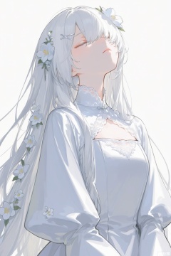 1girl,white dress,dress,original,white hair,lace,long sleeves,solo,hair ornament,closed eyes,lace trim,closed mouth,white background,hairclip,lace trim on sleeves,white flower,flower,hair flower,long hair over one eye,white flower hair ornament,very long hair,hair over one eye,photoshop (medium),white flower in hair,