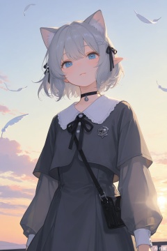 a cute anime-style digital illustration from a close-up camera angle of a shy girl with steel-blue eyes and fluffy ash-grey hair styled in soft side curls, her head is decorated with cat-ear-shaped hair clips, ribbons and tiny bells, her expression is calm and slightly curious as she looks into the viewer’s eyes, her outfit consists of a navy and grey maid-style dress with a small choker and a silver bell at the collar, the background is a soft, cloudy sky with hints of twilight and floating feathers, giving the scene a soft melancholy and cozy mood