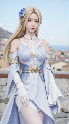 1girl, solo, long hair, looking at viewer, smile, open mouth, bangs, blonde hair, red eyes, gloves, dress, hair between eyes, bare shoulders, twintails, ahoge, :d, sidelocks, outdoors, sky, sleeveless, alternate costume, day, pointy ears, elbow gloves, white gloves, white dress, blue sky, orange eyes, sleeveless dress, low twintails, bug, butterfly, veil, stairs, wedding dress, bridal veil, bride, klee \(genshin impact\)
