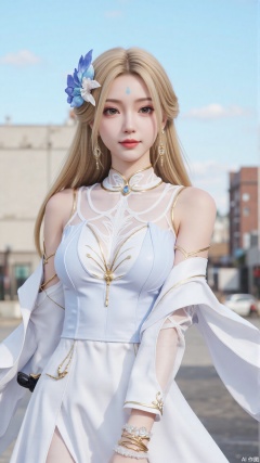 1girl, solo, long hair, looking at viewer, smile, open mouth, bangs, blonde hair, red eyes, gloves, dress, hair between eyes, bare shoulders, twintails, ahoge, :d, sidelocks, outdoors, sky, sleeveless, alternate costume, day, pointy ears, elbow gloves, white gloves, white dress, blue sky, orange eyes, sleeveless dress, low twintails, bug, butterfly, veil, stairs, wedding dress, bridal veil, bride, klee \(genshin impact\)