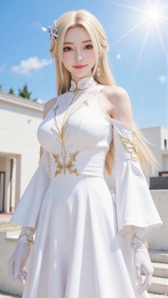1girl, solo, long hair, looking at viewer, smile, open mouth, bangs, blonde hair, red eyes, gloves, dress, hair between eyes, bare shoulders, twintails, ahoge, :d, sidelocks, outdoors, sky, sleeveless, alternate costume, day, pointy ears, elbow gloves, white gloves, white dress, blue sky, orange eyes, sleeveless dress, low twintails, bug, butterfly, veil, stairs, wedding dress, bridal veil, bride, klee \(genshin impact\)
