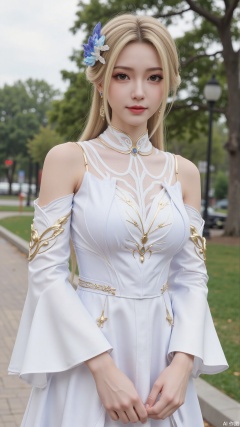 1girl, white wedding dress,looking at viewer, mischevious smile, perfect body, scenery, sharp focus, best quality, masterpiece, detailed outfit, illustration, perfect eyes, finely detailed beautiful anime eyes, realistic skin, intricate details, best lighting, depth of field, ultra high resolution, cowboy_shot, bride