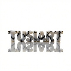 A set of photos of the letters "TUSIART" formed in dendritic agate, translucent milk-white chalcedony with black fern-like inclusions. Backlighting projects delicate shadows onto a crisp white background.