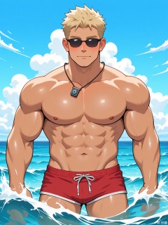 MN, Anime-style drawing of a hunky lifeguard with sun-bleached hair, wearing a red trunks and a whistle around his neck. Ocean waves crash behind him as he shades his eyes, with a minimalist azure sky backdrop.
