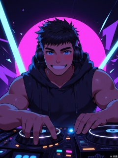 MN, Anime-style drawing of a beefy DJ with headphones, spinning records in a sleeveless neon hoodie. Laser lights pulse around his smirking face, with a gradient black-to-purple club backdrop.