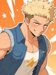 MN, Anime-style drawing of a ripped dude with bleached-blond undercut hair and a smirk, wearing a sleeveless denim vest over a graphic band tee. Sweat glistens on his collarbone, with golden starbursts exploding behind him on a gradient orange background.