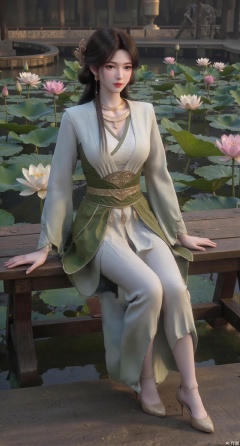 (masterpiece:1.2),best quality,The image is a digital illustration of a young woman sitting on a wooden bench in a pond with lily pads. She is wearing a long dress with design on the chest and sleeves. The dress has a high neckline and short sleeves,Holding a lotus in hand. She has long dark hair styled in loose waves and is wearing gold high heels. The woman is posing with one hand on her hip and the other resting on the edge of the bench. The background is filled with pink and white lotus flowers and green leaves. The overall mood of the image is peaceful and serene,(huge breasts:2.99),(full breasts:2.99),(Background with traditional Chinese architecture, lotus pond and pink lotus flowers:1.39),XyunyunXY,Xmeining,Xjiangziyue,Xweinina,Xyunxiao,Xxiaoqingxue