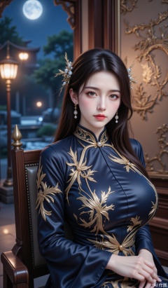 The beauty of cheongsam sat upright on a carved mahogany Taishi chair. The dark blue silk cheongsam embroidered with a gold-line phoenix pattern. The collar is inlaid with jade buckles. The pearl earrings emit a soft halo in the backlight. The background is a hazy night view of Jiangnan gardens. The warm light of the stone lanterns and cool moonlight meets on the Su-embroidered screen. The 8K ultra-clear picture quality highlights the satin luster and embroidered three-dimensional sense of the cheongsam. The shallow depth of field imitates the flowing water of the bamboo forest on the background. The wide-angle lens captures the details of the carved dragon pattern on the back of the chair. The dark black lip glaze and gilded nails show delicate reflections under the warm light. The misty incense burner smoke adds the mysterious oriental atmosphere.