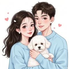 This illustration depicts a warm scene of a young couple and a puppy. The couple wore light blue sweaters of the same color, which looked very harmonious. The woman has long black curly hair, pearl earrings, a gentle smile, big and bright eyes, and a faint blush on her cheeks. The men have short hair, three-dimensional facial features, firm and gentle eyes, and slightly raised corners of their mouths. They held a white puppy together. The puppy looked very cute, with fluffy hair and round eyes, and looked very lively. The overall picture has soft colors and smooth lines, giving people a warm and harmonious feeling.