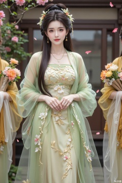 在一片梦幻般的仙境中,一位长发飘逸的女子独自站立,仿佛在独奏一曲无声的乐章。她的黑色长发如瀑布般垂落,发间点缀着精致的发饰,几朵盛开的花朵缠绕其中,仿佛是大自然的精灵在为她编织美丽。她身穿一件印花汉服,汉服上绣满了绚丽的花卉图案,丝绸的质地在朦胧的雾气中若隐若现,散发出一种超凡脱俗的气息。