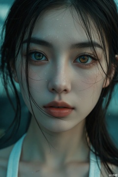 Intense gaze of woman with heterochromatic eyes, one emerald and one amber, raindrops suspended on skin creating micro-reflections, wind-swept hair forming abstract patterns against stormy background, cinematic color grading with teal and orange tones