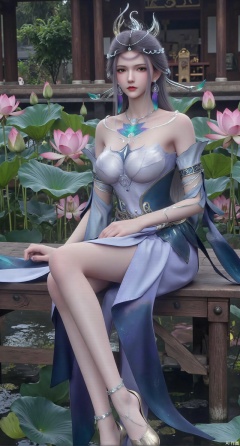 (masterpiece:1.2),best quality,The image is a digital illustration of a young woman sitting on a wooden bench in a pond with lily pads. She is wearing a long dress with design on the chest and sleeves. The dress has a high neckline and short sleeves,Holding a lotus in hand. She has long dark hair styled in loose waves and is wearing gold high heels. The woman is posing with one hand on her hip and the other resting on the edge of the bench. The background is filled with pink and white lotus flowers and green leaves. The overall mood of the image is peaceful and serene,(huge breasts:2.99),(full breasts:2.99),(Background with traditional Chinese architecture, lotus pond and pink lotus flowers:1.39),XyunyunXY,Xmeining,Xjiangziyue,Xweinina,Xyunxiao,Xxiaoqingxue,Xlenhuan