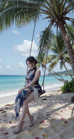 (masterpiece:1.2),best quality,absurdres,masterpiece,original,extremely detailed wallpaper,perfect lighting,Golden sandy beach covered with vibrant flowers, turquoise waves gently lapping the shore, elegant woman in embroidered qipao swinging on a wooden swing under coconut trees, bright flower clusters spreading from sand to palm tree roots, soft natural light filtering through coconut leaves, ocean breeze lifting hair and qipao hem, high-resolution details showcasing petal textures and silk fabric sheen, ultra-wide angle lens capturing coastline panorama, cinematic color grading with soft focus on the central figure,(huge breasts:2.99),(full breasts:2.99),Xanmiaoyi,Xyunwangshu,XlishaoyinY,Xbaixue,XanmiaoyiY,Xxiuqiuhua,XbaiyuerongY,XyunyunX,XqingnvzongZM,Xjuzi,Xshangguanweier,XanmiaoyiXY,XyunyunXY,Xjiangziyue,Xmeining,Xweinina,Xlenhuan,Xbabata