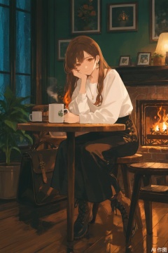 masterpiece, best quality, good quality, very awa, newest, highres, absurdres, 1girl, solo, long hair, looking at viewer, smile, shirt, skirt, brown hair, long sleeves, holding, closed mouth, jewelry, sitting, brown eyes, white shirt, full body, flower, earrings, boots, indoors, black skirt, black footwear, necklace, bag, cup, window, night, brown footwear, chair, table, plant, fire, holding cup, steam, hand on own face, cross-laced footwear, reflection, rain, head rest, wooden floor, mug, hand on own cheek, potted plant, lamp, hand on own chin, stool, coffee, picture frame, vase, coffee mug, drawing \(object\), cafe, wooden table, fireplace, limited palette,