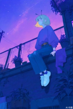 masterpiece, best quality, good quality, very awa, very aesthetic, absurdres, newest, 1other, antennae, arms at sides, bead bracelet, beads, belt, blonde hair, bob cut, bracelet, brick wall, brown belt, building, capri pants, clothesline, denim, flat color, foot dangle, freckles, hanging plant, jeans, jewelry, laundry, light blush, limited palette, long sleeves, night, night sky, on roof, on wall, other focus, outdoors, pants, plant, potted plant, puffy long sleeves, puffy sleeves, purple sky, purple sweater, purple theme, rooftop, scenery, shoes, shooting star, short hair, sitting, sky, socks, solo, star (sky), starry sky, sweater, sweater tucked in, thick eyebrows, happy, unworn clothes, utility pole, white footwear, wide shot, window shutter, wire