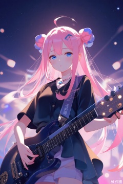 (best quality),(masterpiece),((beautiful:0.75) cute girl:0.75),[clear and clean] pixiv (illustration),gotou hitori,black shirt,concert,holding instrument,guitar,pink long hair,hair ornament,cube hair ornament,hair between eyes,bangs,blue eyes, concept art