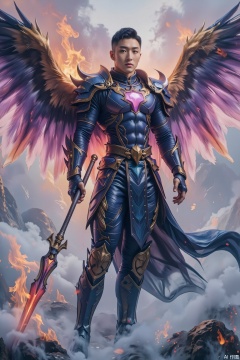 A muscular celestial warrior clad in Azure Phoenix glazed armor, with a flowing light that gradually changes from peacock blue to cherry pink. Behind him unfold hundred-meter-long golden wings, with pale purple flames burning at the edges. The pink-purple sunset glow in the sky contrasts with the peacock blue armor, and the long spear in his hand emits orange-red energy flames. The clouds beneath his feet glow with a blend of pearl white and mint green, singing a glorious battle hymn of safeguarding the celestial realm...jzns,wak,double-exposure,vivid color