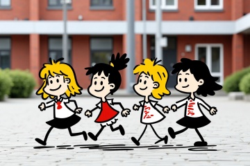 beijihui,A group of cartoon girls are running on the street. The background displays real photos of the school,