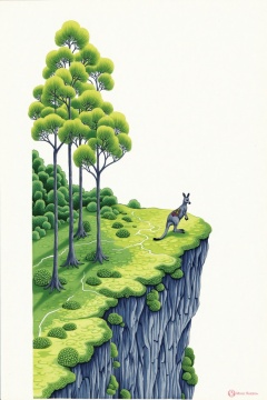 beijihui,Captured from an eye-level perspective,a painting of a gray kangaroo is perched on a cliff face,looking up at the viewer. The kangaroos is facing the right side of the frame,its tail pointing to the left. The cliff face is covered in a layer of dark gray rocks,dotted with small green trees. To the right of the rock face,a large green tree is visible. The background is a stark white,creating a stark contrast to the painting. The painting is a vibrant shade of green,adding a pop of color to the scene.,