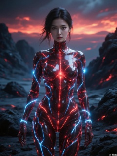 The image depicts a futuristic scene with a woman standing in a landscape that appears to be a volcanic or fiery terrain. She is wearing a form-fitting, transparent suit that resembles a network of glowing red lines, suggesting a high-tech or cybernetic design. The suit is illuminated by blue lines that run down her body, enhancing the impression of advanced technology. The background features dark, rocky terrain with a fiery, glowing horizon, creating a dramatic and otherworldly atmosphere. The overall aesthetic is highly stylized and otherworldly, blending elements of science fiction and fantasy.