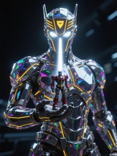 The image depicts a futuristic scene with a humanoid robot standing in the foreground. The robot is adorned with a highly reflective, multi-colored, geometric suit that gives it a futuristic and high-tech appearance. Its helmet features glowing yellow lines and a prominent triangular design on the forehead, emitting a bright beam of light that appears to be directed towards the robot's chest.